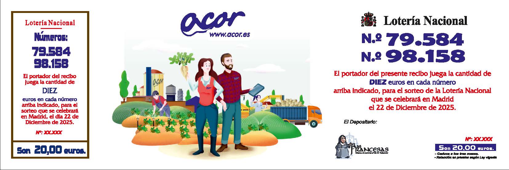 Ya se encuentra a la venta la lotería de Navidad de la Cooperativa ACOR que está disponible por ventanilla en la administración de Las Francesas de la Calle Santiago, en Valladolid, y en su canal online en la página web www.loterialasfrancesas.es, al igual que el año pasado.