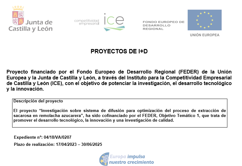 Objeto de la subvención: Investigación sobre el sistema de difusión para optimizar el proceso de extracción de sacarosa en remolacha azucarera. Gracias a la ejecución del proyecto se espera lograr un incremento en el rendimiento de la remolacha.