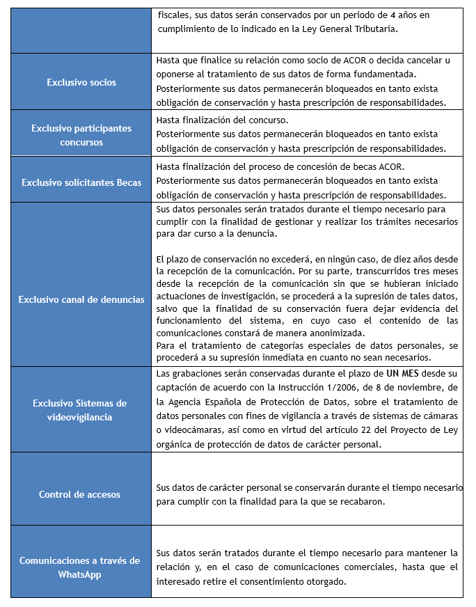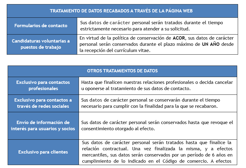 Usted como titular de datos tiene derecho a obtener confirmación sobre la existencia de un tratamiento de sus datos, a acceder a sus datos personales, solicitar la rectificación de los datos que sean inexactos o, en su caso, solicitar la supresión, cuando entre otros motivos, los datos ya no sean necesarios para los fines para los que fueron recogidos o usted como interesado retire el consentimiento otorgado. ACOR tratará y conservará sus datos de acuerdo con la normativa vigente, sin perjuicio de que como interesado pueda solicitar en todo caso, la limitación del tratamiento de sus datos. En ciertos supuestos podrá